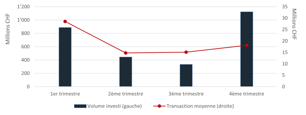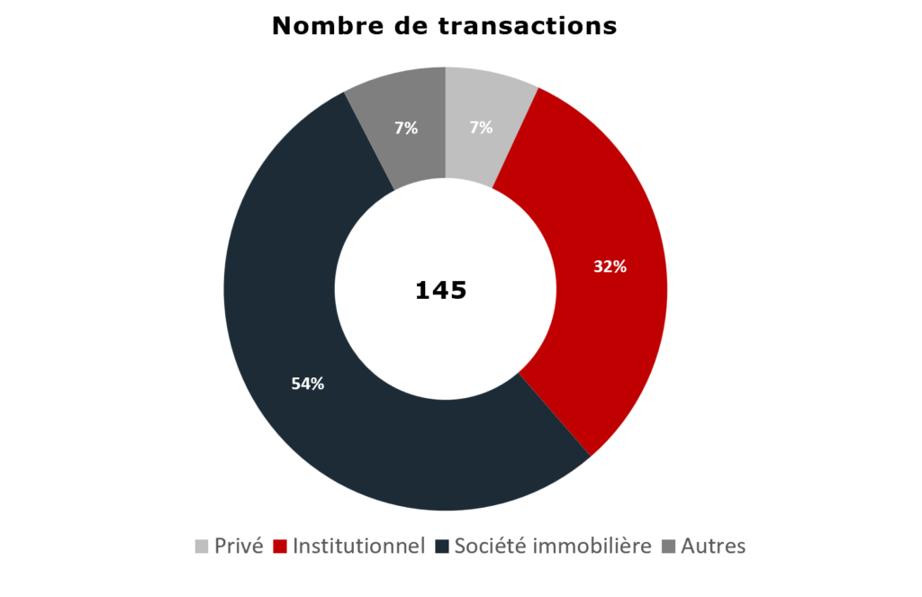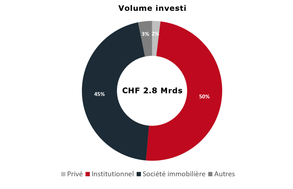 Au niveau du volume investi (graphe de droite), les institutionnels arrivent en tête avec presque 50% du volume total investi et une transaction moyenne qui s’établit à environ 30 Mio pour cette classe d’acheteur. Loin derrière, on retrouve les investisseurs privés dont le volume investi atteint tout juste 2% et dont la transaction moyenne est d’environ CHF 5.4 Mio.