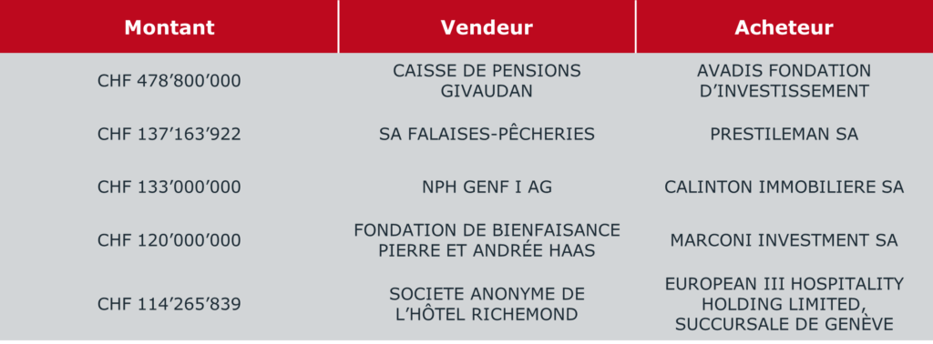 Les 5 transactions les plus importantes représentent à elles seules 37% du volume investi contre 24% en 2022. La plus élevée, d’un montant d’environ CHF 479 Mio, porte sur l’acquisition d’un portefeuille de 16 immeubles d’habitation par la fondation de prévoyance Avadis auprès de la caisse de pensions Givaudan. On dénombre également 2 transactions dans la Rue du Rhône, symbole du « prime » genevois, pour un total de 253 Mio (Calinton Immobilère SA et Marconi Investment SA).