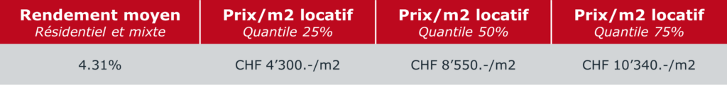 Pour cette étude de marché, nous avons essayé d’estimer le rendement brut moyen des transactions réalisées. Pour ce faire, nous avons utilisé plusieurs applications basées sur l’IA, nous permettant de compiler différentes données utiles au calcul des surfaces locatives probables et à l’estimation des loyers de marché. Ainsi, nous avons pu déterminer les états locatifs potentiels des immeubles résidentiels et mixtes. Les résultats pour les immeubles commerciaux ne nous paraissant pas pertinents, nous les avons exclus de notre analyse. En combinant nos résultats avec les prix de vente communiqués par la FAO et en écartant les valeurs extrêmes, cela nous a permis de déterminer un rendement brut moyen de 4.31% sur le volume d’environ CHF 1.45 Mrd investi dans les immeubles résidentiels et mixtes.
