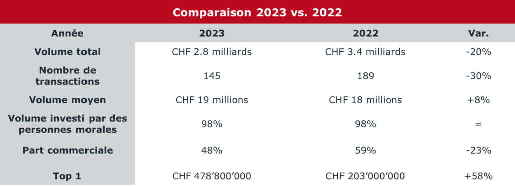 NB: Seules les transactions d’un montant supérieur à CHF 2 millions parues sur la FAO sont incluses dans le volume de transaction annuel. De plus, les transactions portant sur des terrains ne sont pas incluses.