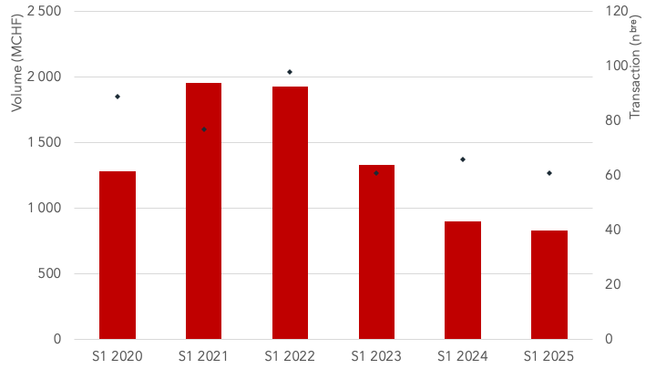 After a subdued first quarter, during which CHF 285 million was invested, the second quarter proved more dynamic. Over this period, CHF 540 million was traded on the Geneva market. For the first half of the year, the total invested volume therefore amounts to CHF 826 million, down 8% compared with 2024 and 38% below the levels recorded in the strongest years of the period under review. In total, 61 transactions were observed, corresponding to an average volume of CHF 13.5 million.