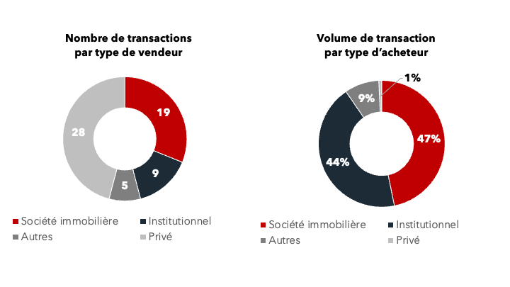 On the buy side, real estate companies and institutional investors continue to dominate the market, accounting for 91% of total invested volume. On the sell side, private owners rank first in terms of number of transactions, with 46% of deals, but real estate companies lead in terms of volume, with 41% of the total.