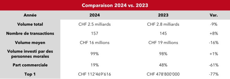 - Total transaction volume of CHF 2.5 billion (vs. 2.8 billion in 2023)