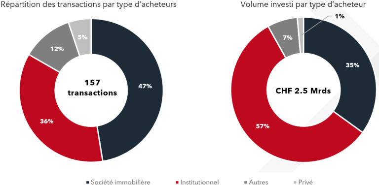 In terms of invested volume (right-hand chart), institutional investors are in the lead with 57% of total volume and an average transaction size of around CHF 25 million. They are followed by real estate companies with 35% of total volume and an average deal size of approximately CHF 12 million. Far behind, private investors account for just 1.4% of total invested volume, with an average transaction size of around CHF 4.3 million.