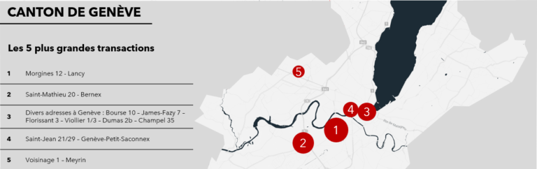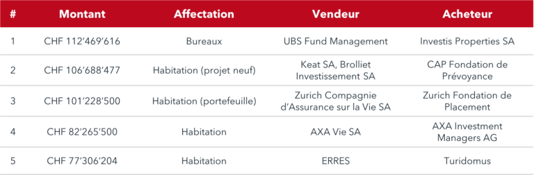 The five largest transactions accounted for 20% of the total invested volume, compared with 37% in 2023 and 24% in 2022. The largest, amounting to approximately CHF 112 million, concerned the acquisition of an office building by Investis Properties from one of UBS’s funds. Two of the top-five transactions were transfers between vehicles within insurance companies. Notably, no major transaction was recorded in Geneva’s CBD.