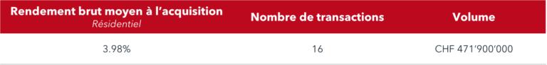 This analysis results in an average gross entry yield of 3.98% for residential buildings. It is worth noting that the prime gross entry yield stands at 3.22% for a building located in the Plainpalais district, sold by a Swiss Life real estate fund to a real estate company.
