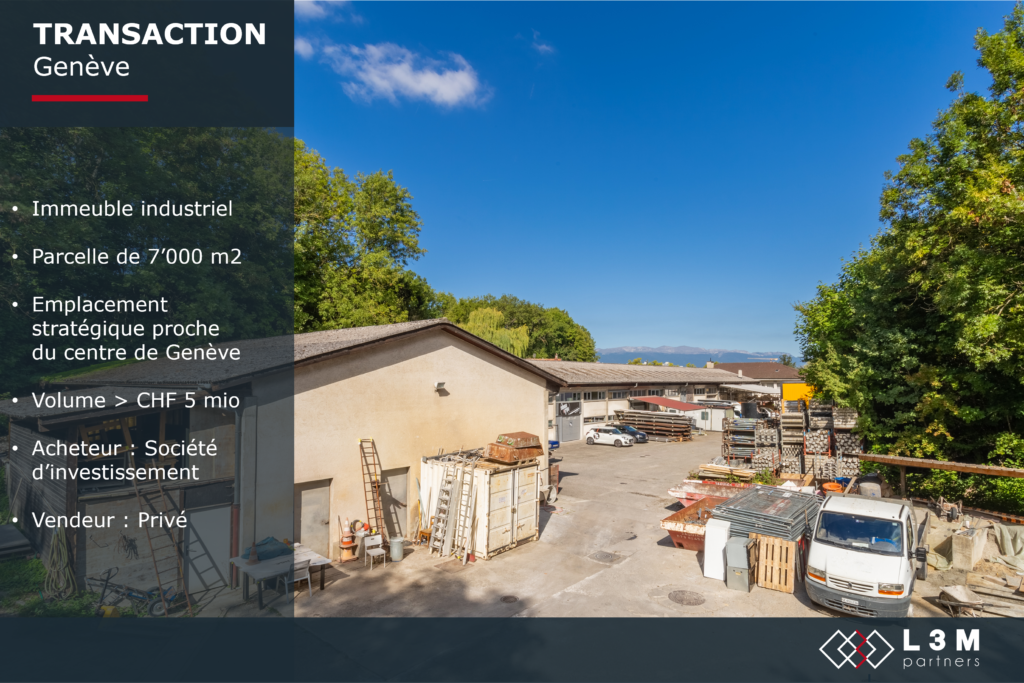 Dans le cadre de notre partenariat avec DBS Group, L3M Partners a accompagné un client privé sous la forme d’un mandat «sell-side » dans la vente d’un immeuble industriel situé sur une parcelle de 7’000 m2 dans la commune de Lancy.